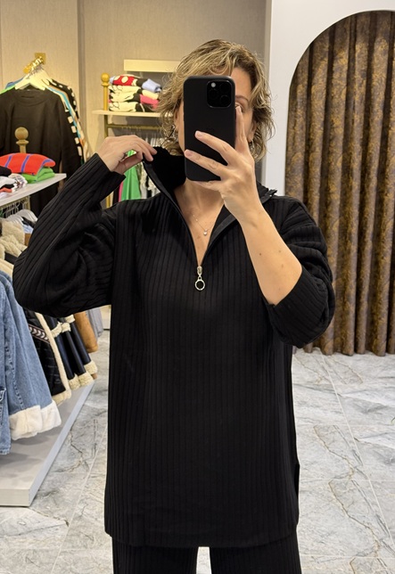 İki İplik Kapüşonlu Hırka Model Takım Siyah
